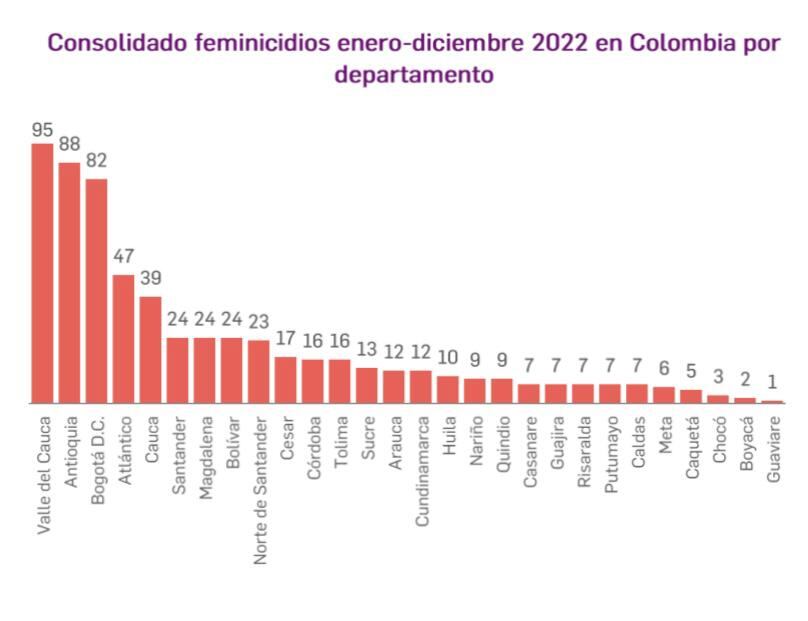 El departamento donde ocurrieron más muertes violentas de mujeres fue en el Valle del Cauca con 95, seguido por Antioquia con 88 y Bogotá con 82. Abril fue el mes con más casos con 67 y, de los 612 casos, 17 son registrados como transfeminicidios.