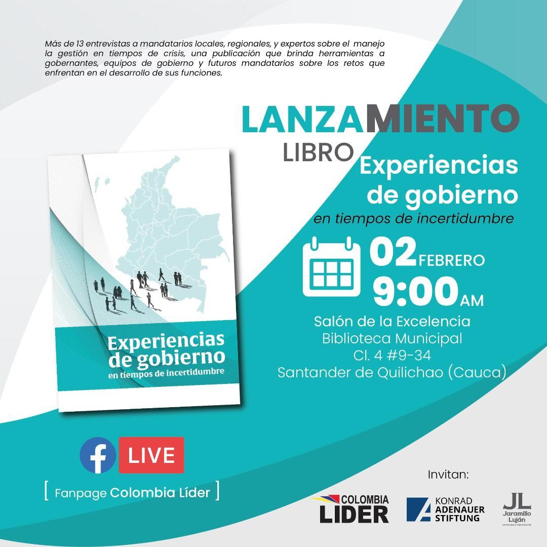 A 8 meses de las elecciones regionales para elegir a las autoridades locales y miembros de corporaciones públicas (alcaldes, gobernadores, concejales y diputados, la firma consultora internacional Jaramillo Luján Estrategia y Comunicación, en alianza con la Fundación alemana Konrad Adenauer y la Fundación Colombia Líder lanzarán el 2 de febrero el libro Experiencias de Gobierno en tiempos de incertidumbre.