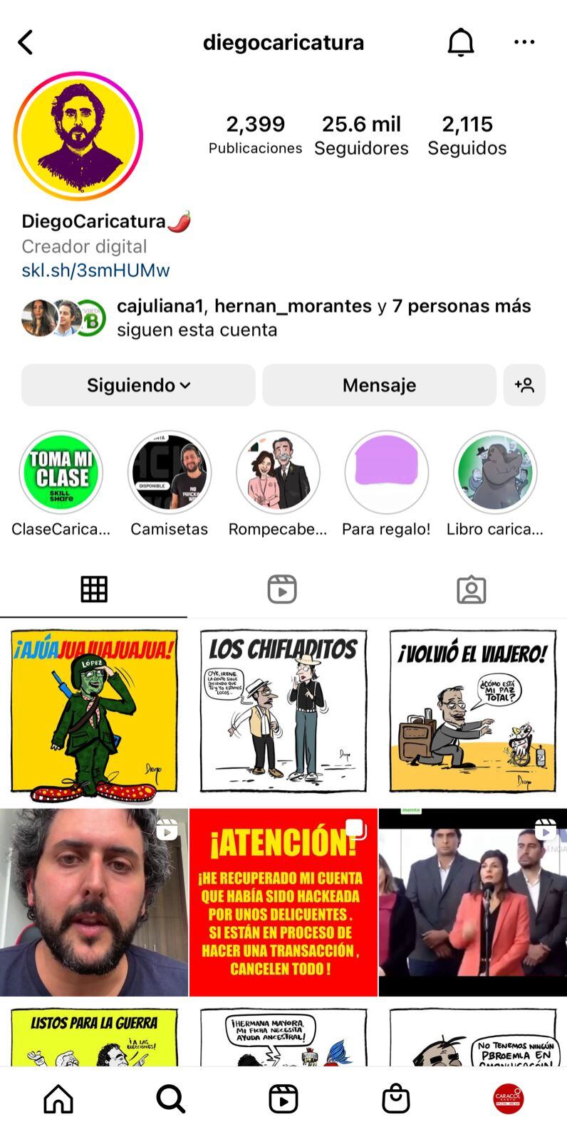 “Cuando ellos accedieron a mi cuenta de Instagram diegocaricatura que es una cuenta donde yo publico caricaturas editoriales, mi opinión sobre la actualidad sociopolítica del país. Normalmente no vendo nada. La gente que hackeo la cuenta incurren en el delito de estafa y empiezan a publicar historias donde están vendiendo celulares y computadores a un precio ridículo.”