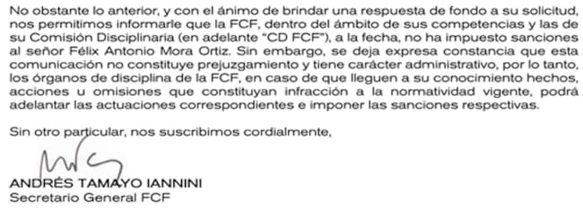 “No existe ningún tipo de vínculo de naturaleza contractual, laboral y/o comercial entre el señor anteriormente mencionado y la FCF(...) No obstante lo anterior, le informamos que en la FCF se han recibido quejas en contra del señor Félix Antonio Mora, las cuales están siendo tramitadas al interior de la CD FCF teniendo en consideración el ámbito de su competencia” indicó la FCF.