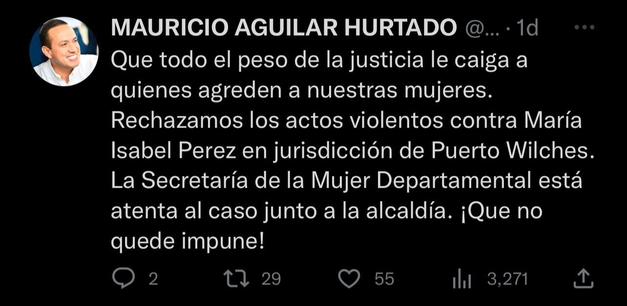 A su vez, el gobernador de Santander, Mauricio Aguilar mediante su cuenta de twitter pidió que todo el peso de la justicia caiga sobre quienes agreden a las mujeres y rechazó los actos contra María Isabel Perez.