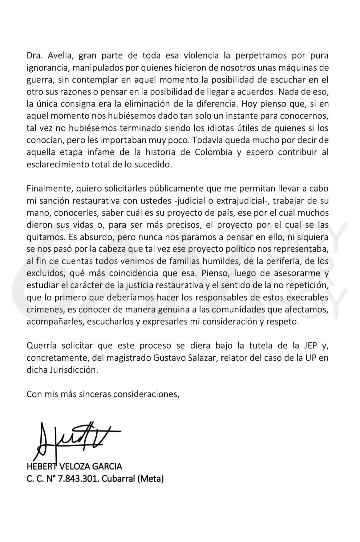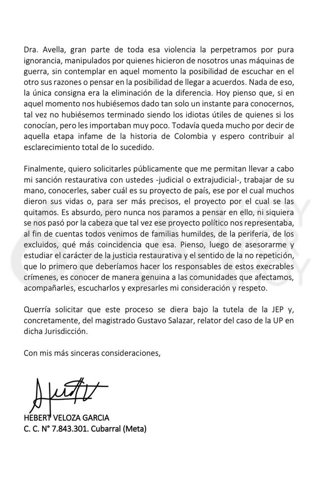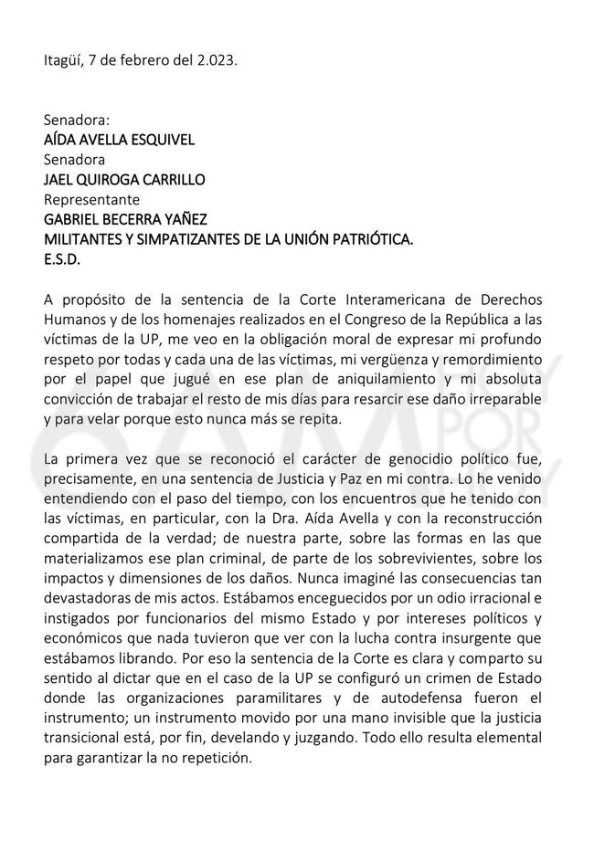 La carta de “HH” fue enviada desde la cárcel de Itagüí a la senadora Aida Avella, Jael Quiroga y Gabriel Becerra, militantes de la Unión Patriótica, a propósito de la sentencia de la Corte Interamericana de Derechos Humanos y de los homenajes realizados en el Congreso a las víctimas de la UP, para aceptar su “verguenza y remordimiento por el papel que jugó en ese plan de aniquilamiento” en contra los miembros del partido político.