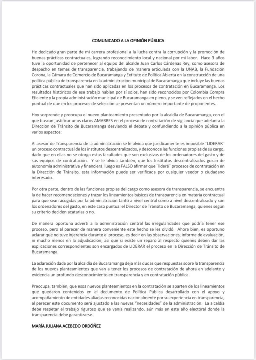 Comunicado de María Juliana Acebedo. ex asesora de transparencia de la Alcaldía de Bucaramanga.