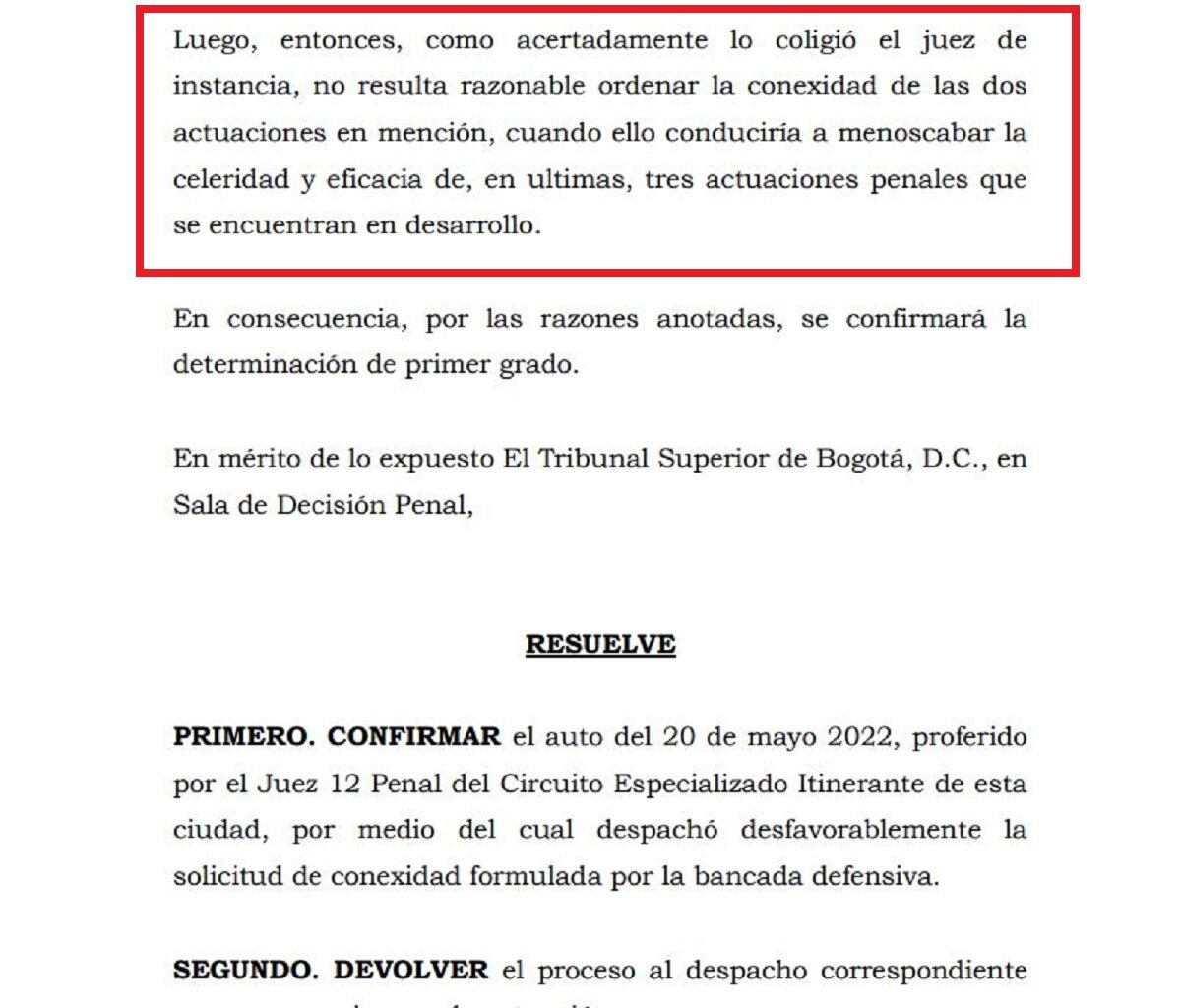 El Tribunal Superior de Bogotá al examinar el caso determinó que esa petición no es posible porque se trata de procesos, delitos y víctimas diferentes.