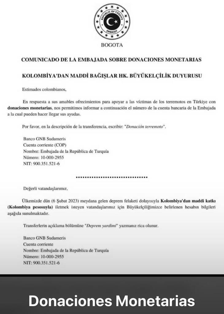 Las donaciones en especie se recibirán hasta el viernes 10 de febrero en Agencia de Cooperación y Coordinación (TIKA) en la Calle 70 9-11, y desde el 11 de febrero hasta el 17 de febrero, se recibirán en la embajada de Turquía en Bogotá, Cll 76 no 8-47.
