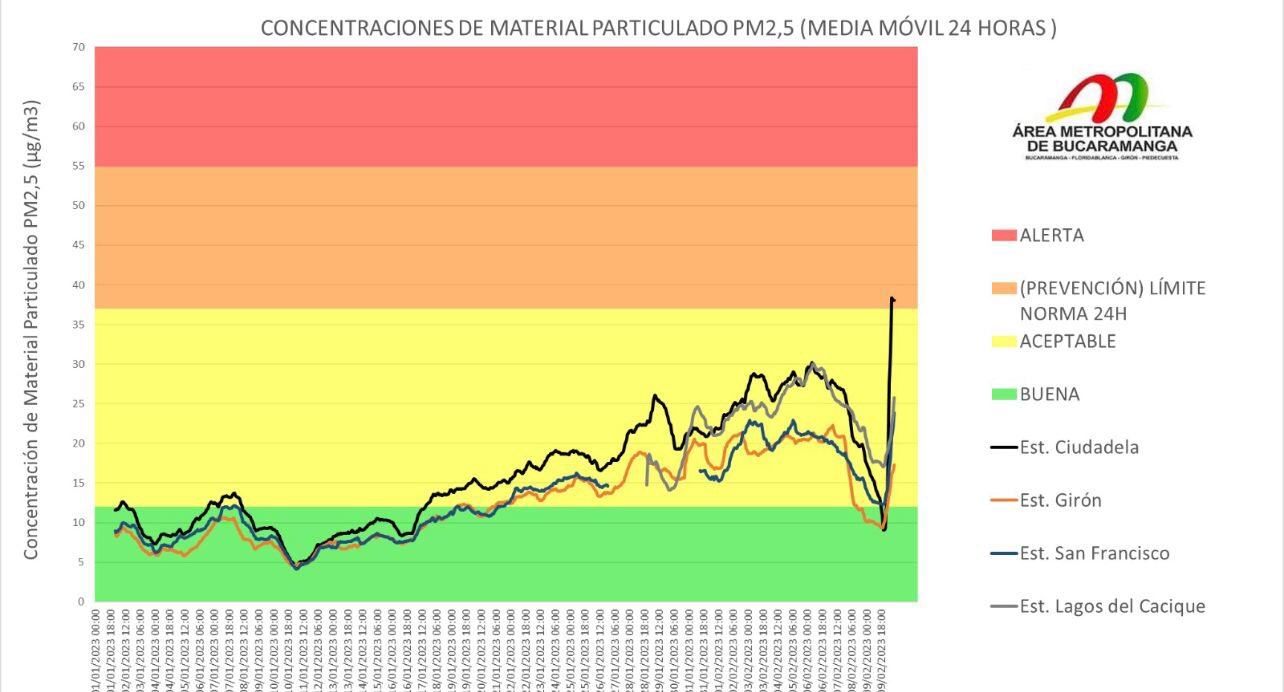 Cabe resaltar que días atrás las autoridades reportaron que las partículas provocadas por incendios forestales ya han venido afectando la calidad del aire en la capital santandereana, debido a que en los últimos 20 días se ha incrementado la presencia de material particulado generado por los incendios forestales que se han reportado en zonas del departamento de Santander como Ruitoque, Los Santos y El Cañón del Chicamocha.