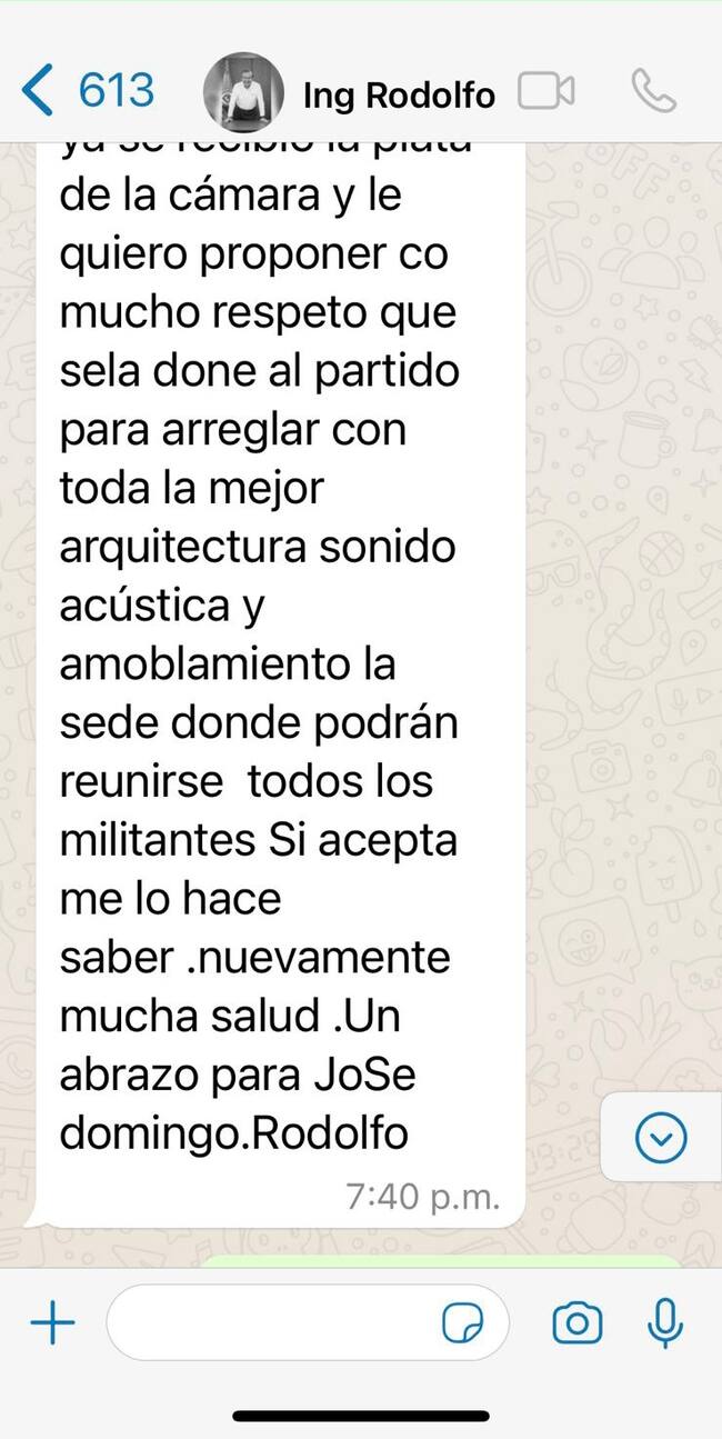 “Yo le dije, ‘ingeniero, cuál donar al partido, si nunca he hecho parte, no soy militante’. Además, me escribió que era para el arreglo, la estructura y la modificación de las oficinas. El que no conozca la oficina del ingeniero que vaya y la conozca cómo es de bonita. Entonces, ¿para qué esa plata? Después de tantos meses de no hablar me parece descarado que me escriba para eso”, contó.
