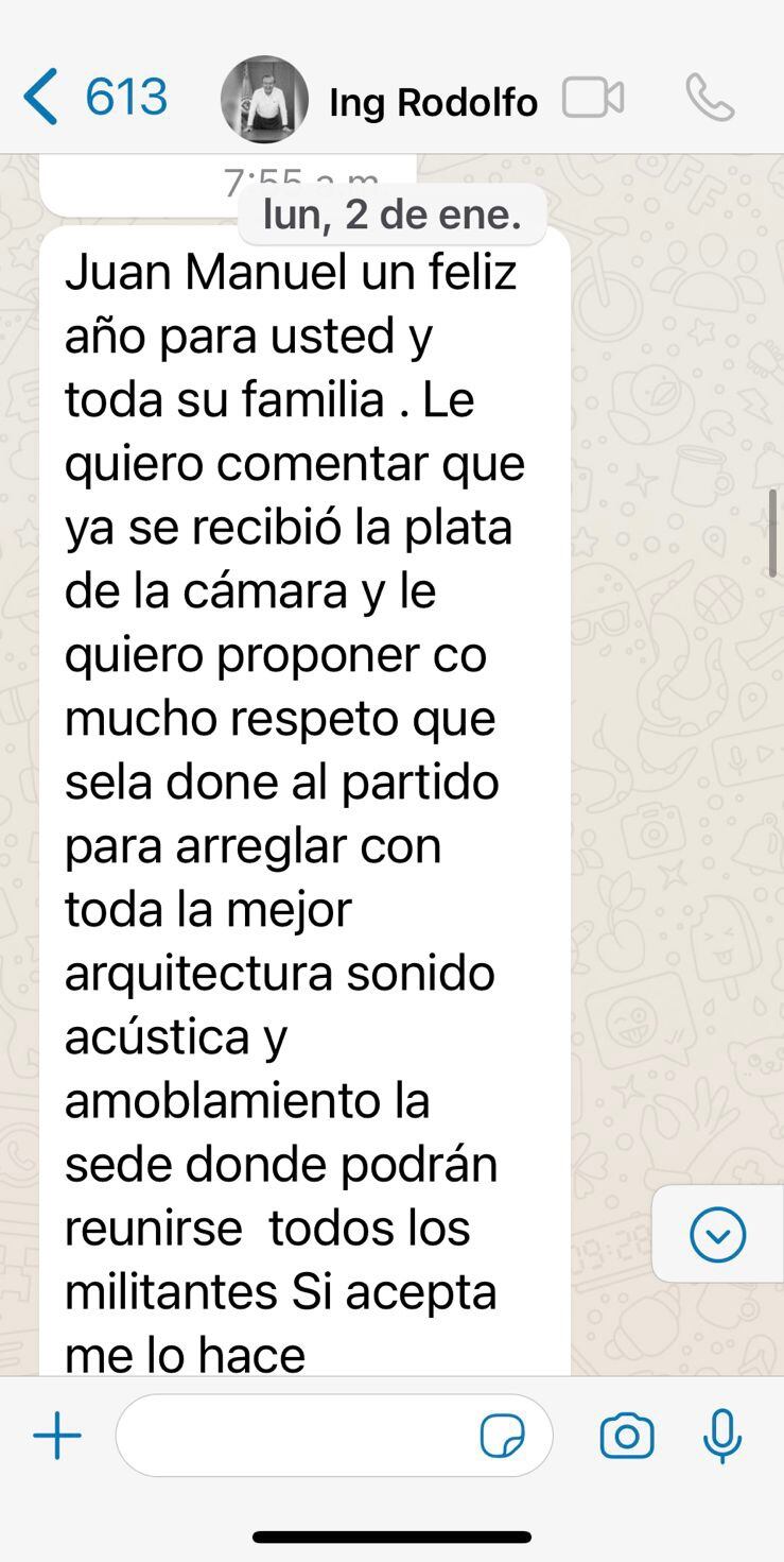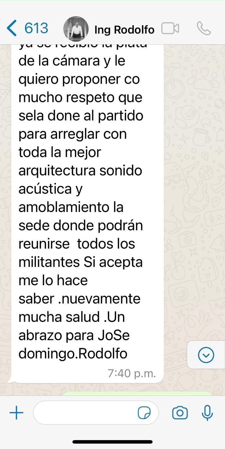 Asimismo, el congresista se refirió a los mensajes que recibió de Hernández pidiéndole que hiciera esa donación de los $109.611.000 a los que tendría derecho, para “remodelar las oficinas del partido”.