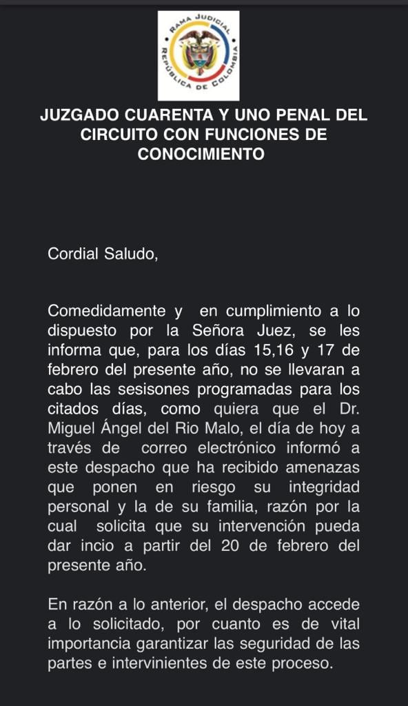 Del Río es uno de los abogados de víctimas en el caso que se sigue en contra del expresidente Álvaro Uribe por presunta compra de testigos y fraude procesal, y se tenía previsto que hoy (miércoles 15 de febrero) y hasta el viernes(17 de febrero) iba a intervenir para oponerse a la solicitud de preclusión.