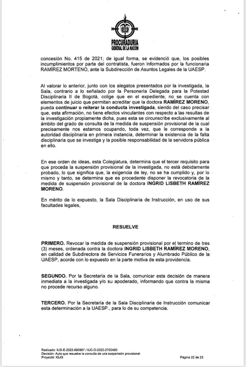 El ente de control, levantó la suspensión provisional, a la Subdirectora de la Unidad Administrativa Especial de Servicios Públicos (UAESP), Ingrid Ramírez Moreno, por falta de material probatorio en medio de la investigación disciplinaria, por el presunto caso de corrupción en adjudicación de contratos para administrar los cementerios Distritales.