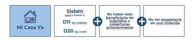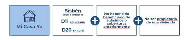 En áreas urbanas, los hogares en Sisbén clasificados entre los grupos A1 y C7 reciben un subsidio de 30 salarios mínimos mensuales legales vigentes (SMMLV) para el pago de su cuota inicial. Por su parte, los hogares con una clasificación de Sisbén entre C8 y D11 tendrán un subsidio correspondiente a 20 SMMLV. En áreas rurales, aquellos con Sisbén entre A1 y C14 reciben un subsidio de 30 SMMLV, mientras que a los que tienen una clasificación de Sisbén entre C15 y D20, se les otorgará un subsidio de 20 SMMLV.