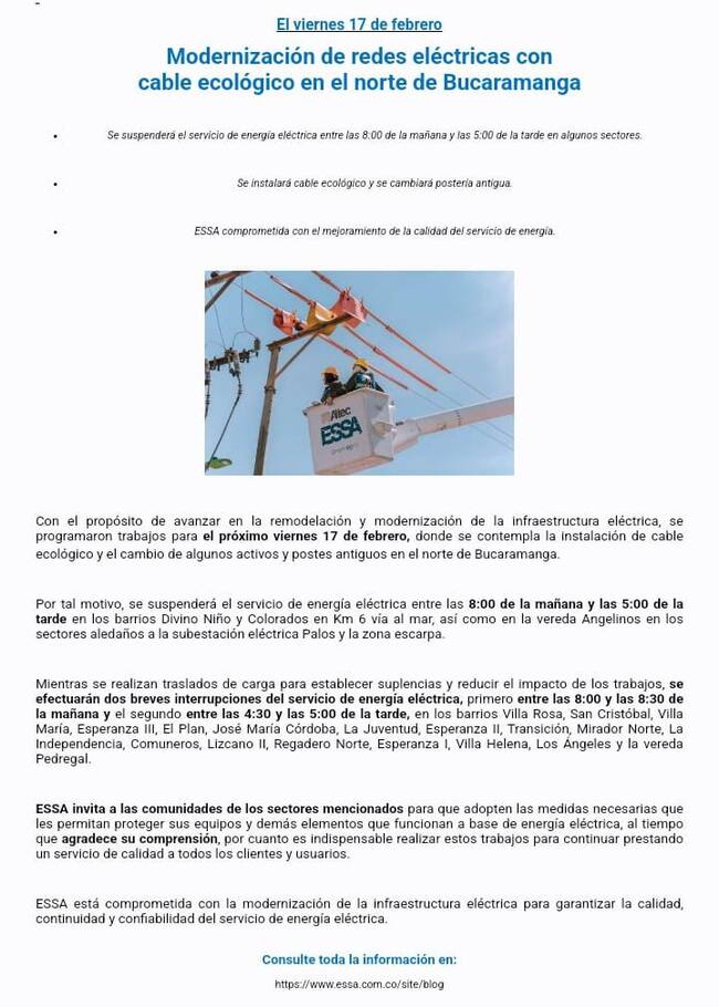Wilton Flórez Ortiz, jefe de operaciones de la Electrificadora de Santander, detalló sobre algunos barrios que se verán afectados. “Villa Rosa, San Cristóbal, Villa María, Esperanza III, El Plan, José María Córdoba, La Juventud, Esperanza II, Transición, Mirador Norte, La Independencia, Comuneros, Lizcano II, Regadero Norte, Esperanza I, Villa Helena, Los Ángeles y la vereda Pedregal.