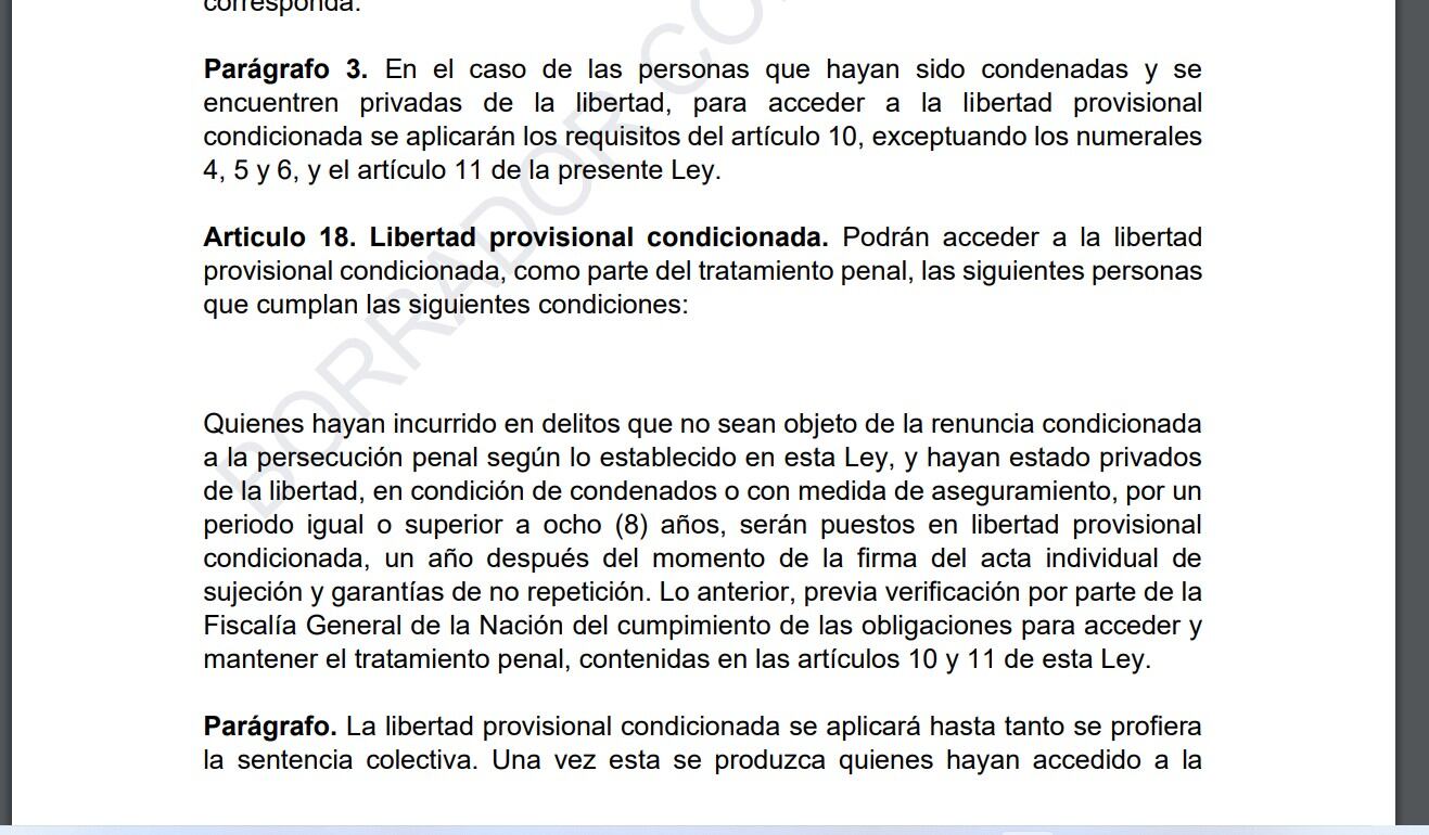 Este último artículo dice que, quienes hayan sido condenados por un periodo igual o superior a ocho años de prisión podrán solicitar la libertad condicionada un año después del momento de la firma del acta individual de sujeción y garantías de no repetición.