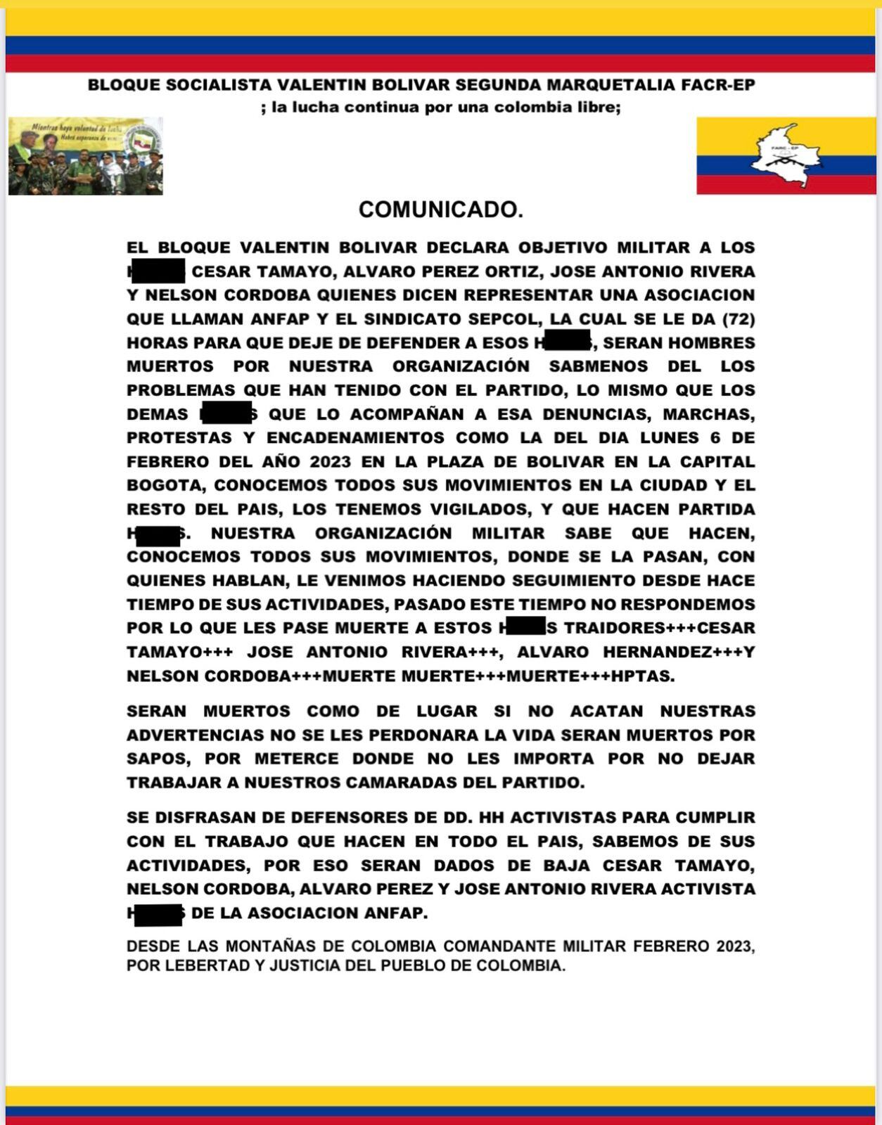 Se trata de Nelson Córdova, presidente nacional de SEPCOL, Álvaro Hernández, José Antonio Rivera Y Cesar Augusto Tamayo, directivos de la ANFAP, quienes recibieron un panfleto en el cual el Bloque Valentín Bolívar Segunda Marquetalia Farc- Ep les daba 72 horas, desde el 13 de febrero a las 7:30 P.M. para dejar de defender a líderes y firmantes del acuerdo de paz y dejar de protestar en contra del partido Comunes.