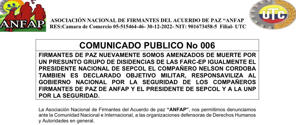 Miembros Directivos de la Asociación Nacional De Firmantes Del Acuerdo De Paz (ANFAP) y el presidente del sindicato (SEPCOL), están denunciando amenazas de muerte y aseguran que fueron declarados objetivo militar por una de las presuntas disidencias de las extintas FARC.