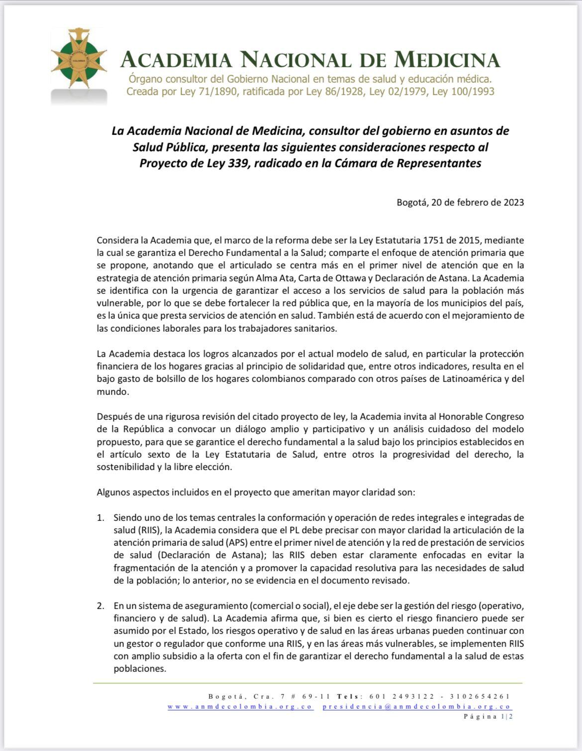 La Academia Nacional de Medicina, institución científica que además de contribuir al estudio y progreso de la medicina, es el organismo consultor y asesor del Gobierno Nacional en todos los temas relacionados con la salud pública de Colombia expresó sus preocupaciones ante las controversias que se han presentado por la reforma a la salud.