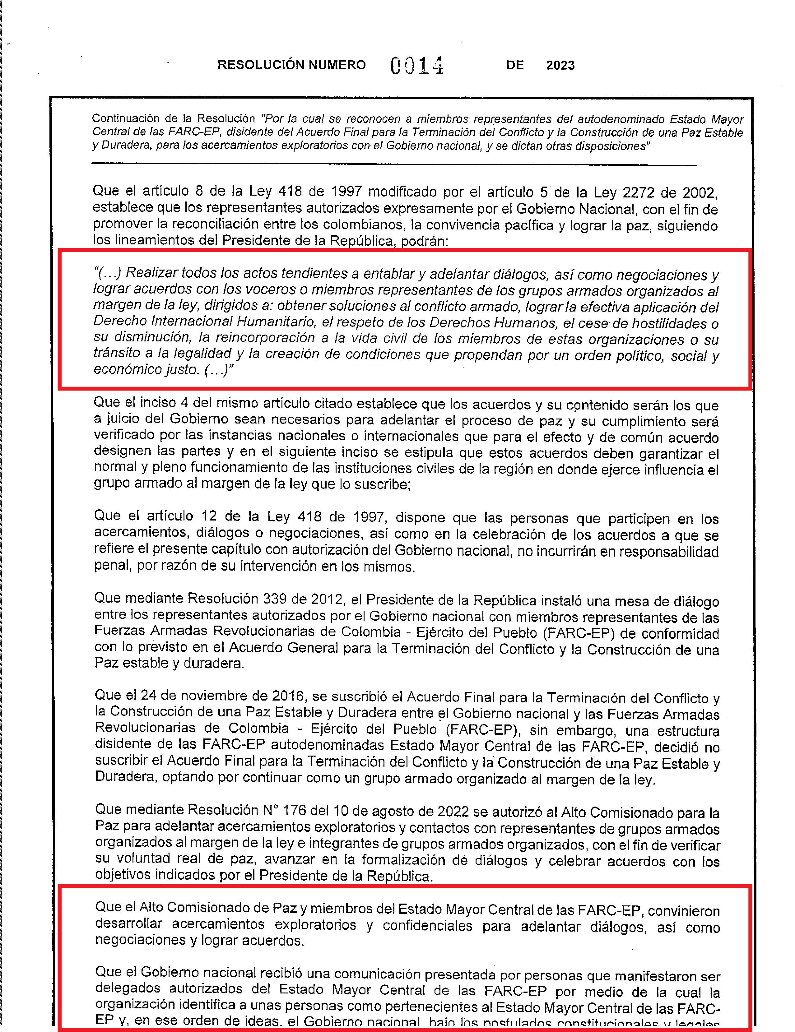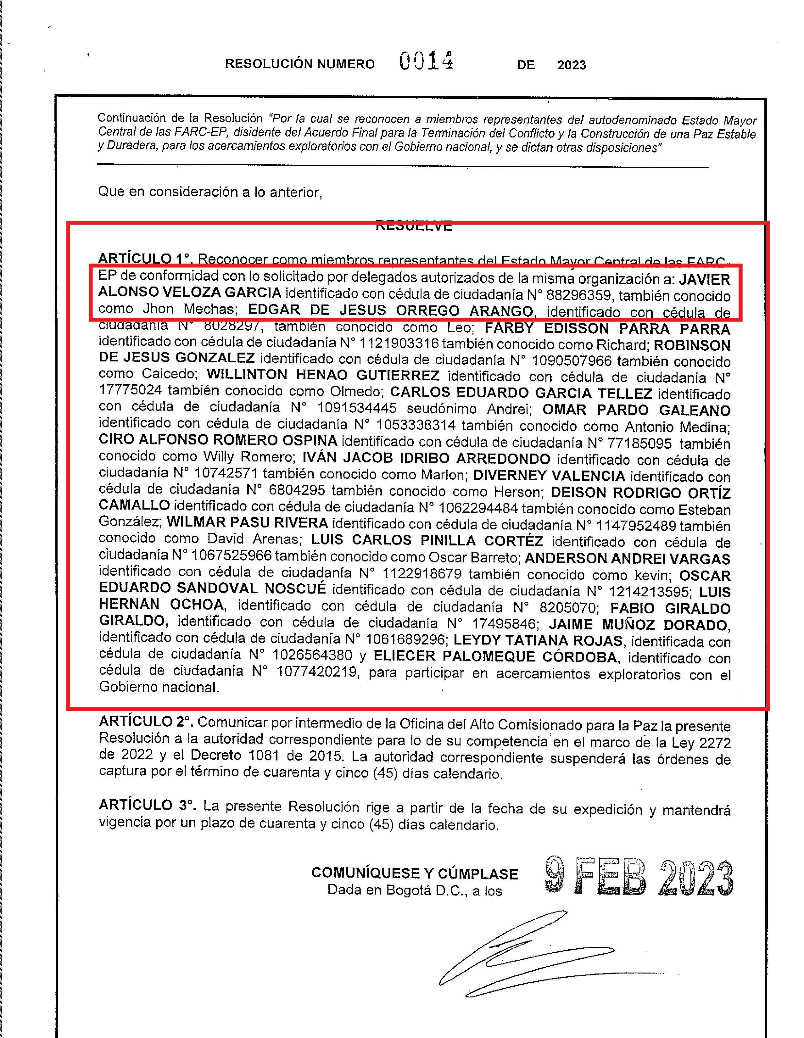 Él junto a otros 19 disidentes del denominado Estado Mayor Central de las FARCEP aparecen en la resolución que la Presidencia le envió a la Fiscalía para que suspenda las órdenes de captura y poder realizar acercamientos exploratorios y confidenciales para adelantar diálogos, negociaciones y acuerdos.