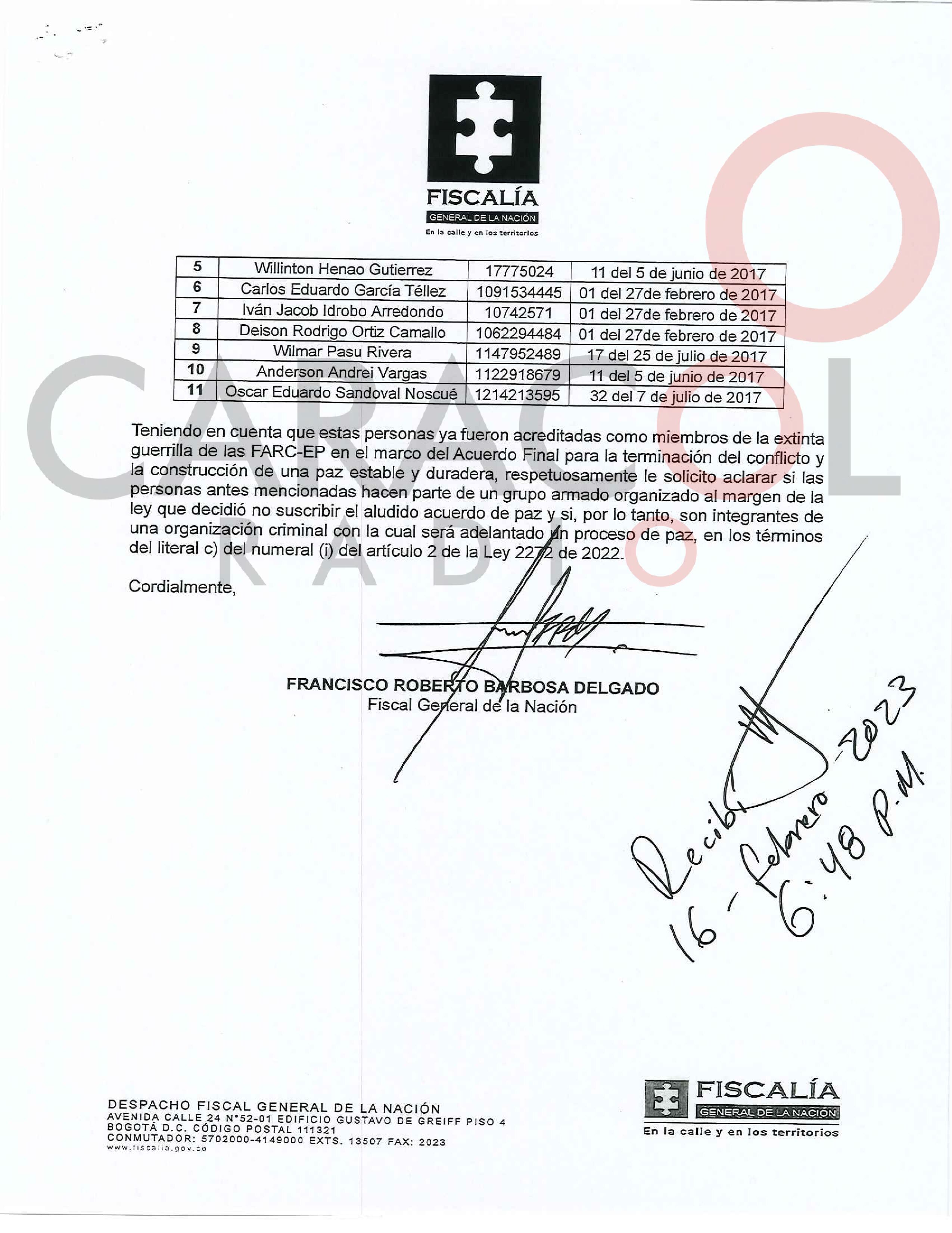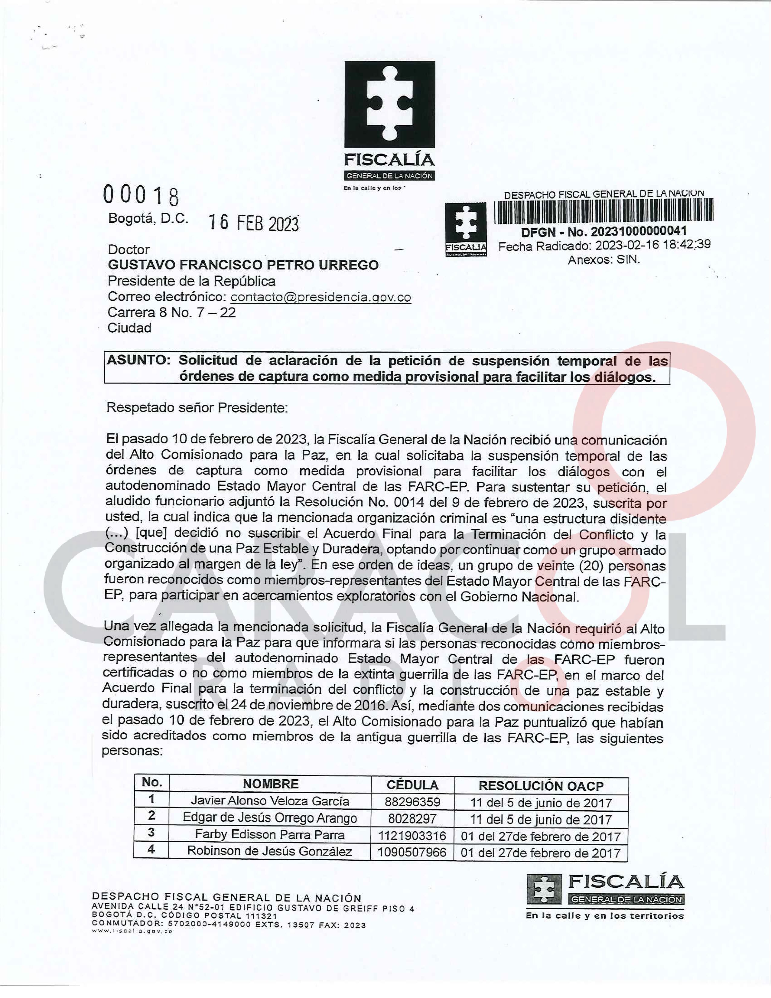 Caracol Radio también conoció la carta de la Fiscalía donde pidió al gobierno Nacional aclarar si los 20 disidentes mencionados hacen parte del grupo armado organizado que decidió no suscribir el acuerdo de paz y también pide precisar si todos ellos se adelantará un proceso de paz.