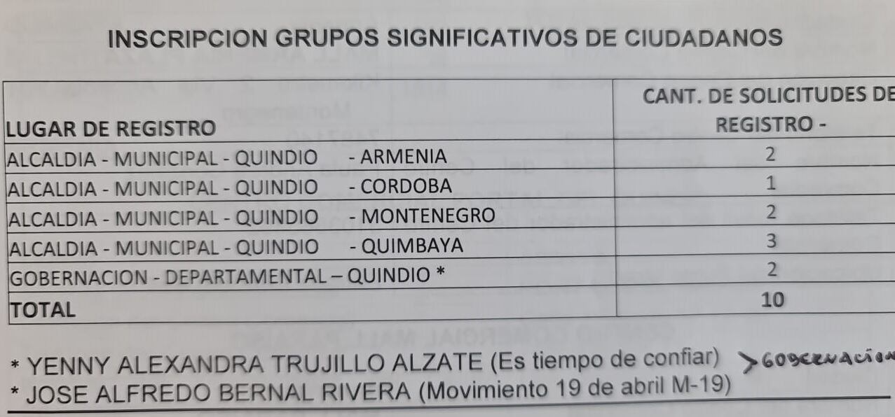 A 8 meses de las elecciones regionales programadas para el 29 de octubre, en el Quindío según la registraduría ya se han inscrito 10 grupos significativos de ciudadanos que recoger firmas para inscribir candidatos a alcaldías de municipios, concejos, asamblea, alcaldía de Armenia y gobernación del Quindío.