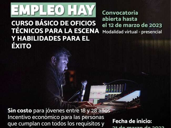 Si usted quiere mejorar su perfil laboral, hacer un fortalecimiento en competencias blandas y tener una capacitación técnica, puede inscribirse en el curso básico de oficios técnicos para la escena y habilidades para el éxito.