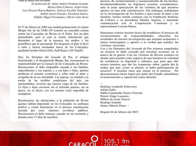 Hoy cuando las familias se preparan para conmemorar uno de los hechos que marcó la historia de la violencia en el departamento del Huila, se conoció sobre el documento suscrito por los hoy firmantes del Acuerdo de Paz; del antiguo Secretariado y el desaparecido Bloque Sur, donde reconocen la responsabilidad por la masacre de los nueve concejales de Rivera, Huila.