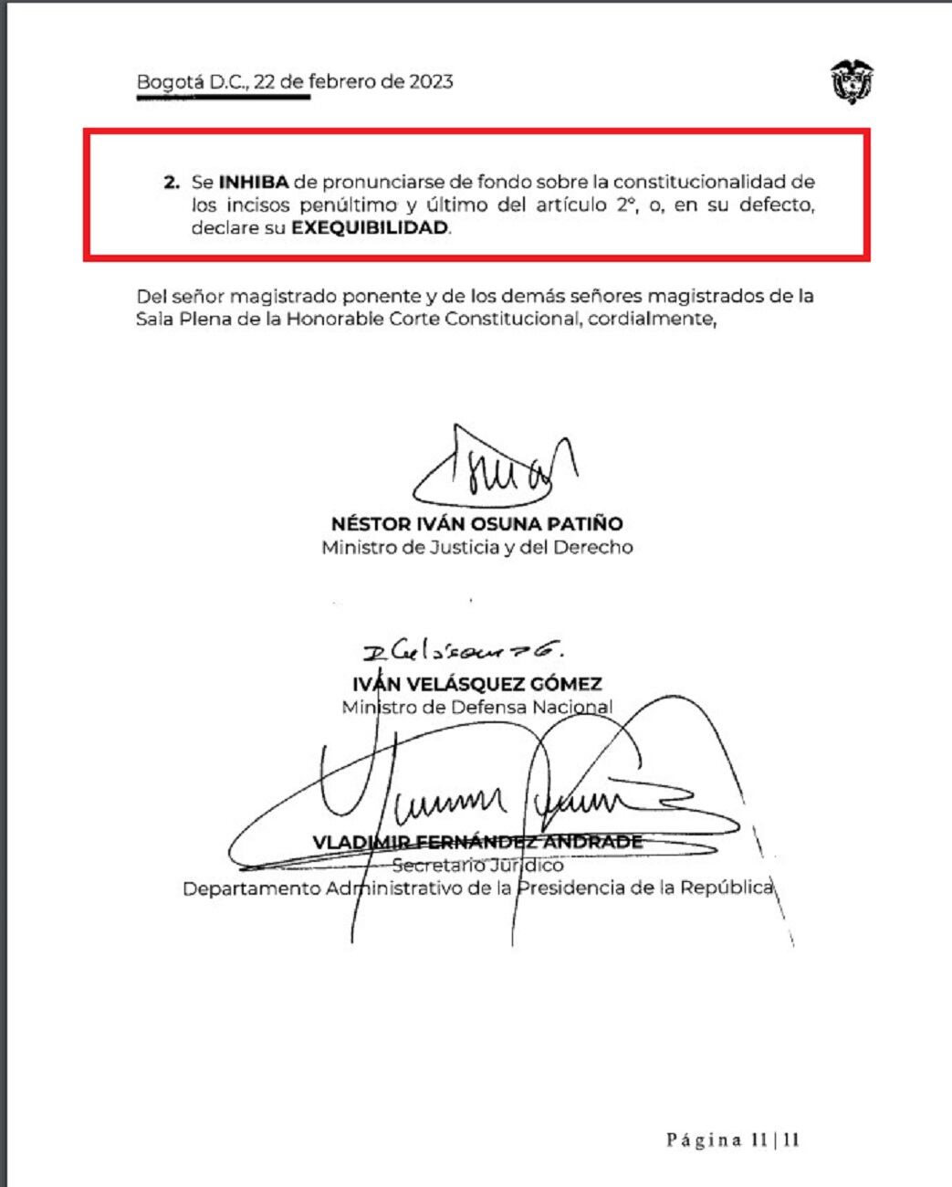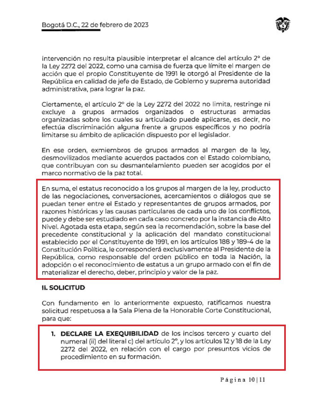 En un concepto de 12 páginas el ministro de Justicia Néstor Osuna y el secretario Jurídico del Departamento Administrativo de la Presidencia de la República, Vladimir Fernández, le pidieron a la Corte Constitucional que declare exequible el artículo segundo de esa ley de la “paz total”. Es decir, que deje en firme.