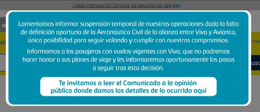 Al ingresar a la página web de Viva, los usuarios se encontraron con un aviso en el que se lee: “Lamentamos informar la suspensión temporal de nuestras operaciones dada la falta de definición oportuna de la Aeronáutica Civil de la alianza entre Viva y Avianca, única posibilidad para seguir volando y cumplir con nuestros compromisos”.