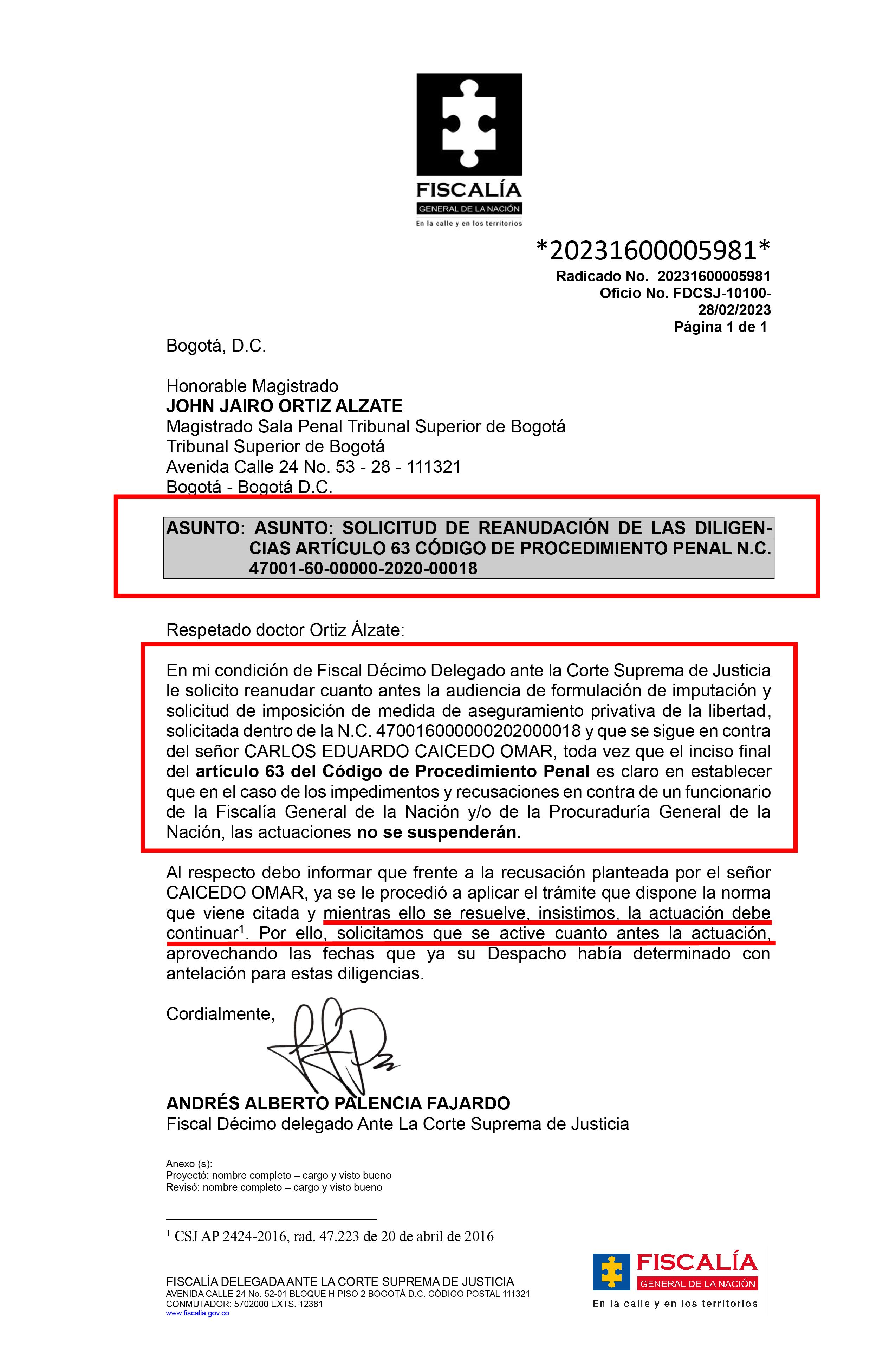 Caracol Radio conoció que la Fiscalía en un oficio solicitó al magistrado del Tribunal Superior Jhon Jairo Ortiz, reanudar cuanto antes la audiencia de imputación de cargos contra el gobernador Carlos Caicedo, porque la norma indica que, pese a la recusación, la diligencia no se suspende.