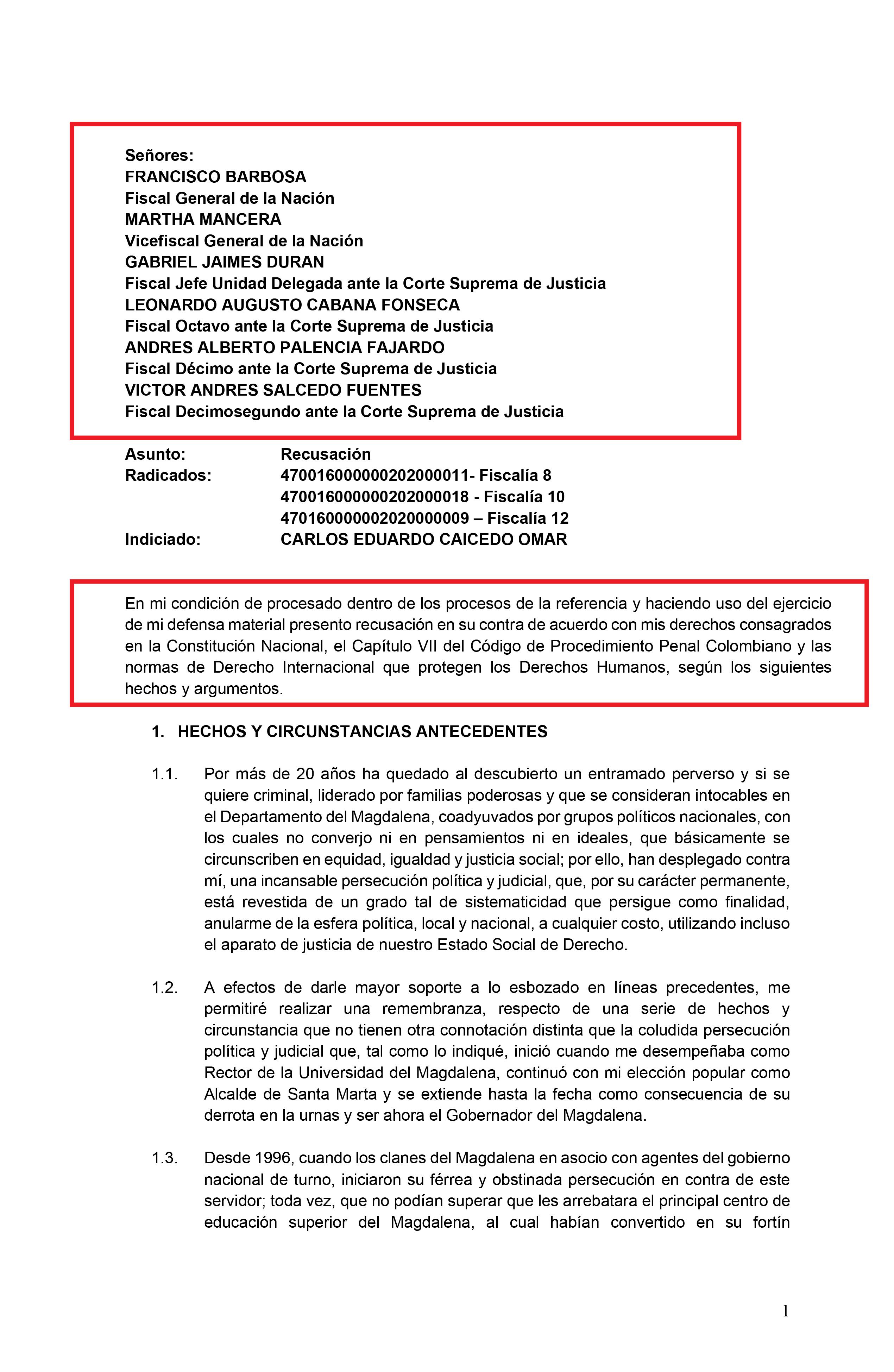 La razón, el gobernador Caicedo recusó al fiscal del caso y a tres fiscales más de la Delegada ante la Corte, al Fiscal General y a la vicefiscal, porque alega que no hay imparcialidad en su caso.