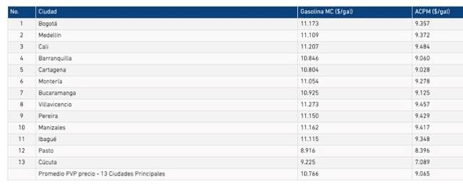 Para marzo de 2023 el precio de venta al público de la gasolina corriente en las diferentes ciudades del país, salvo en Pasto y el resto del departamento de Nariño, se ajustará en $400 por galón, ubicándose en promedio en $10.766 por galón.