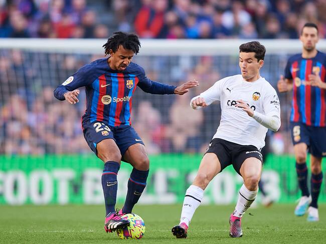 BARCELONA, ESPAÑA - 5 DE MARZO: Jules Kounde del FC Barcelona compite por el balón con Hugo Guillamon del Valencia CF durante el partido de LaLiga Santander entre el FC Barcelona y el Valencia CF en Spotify Camp Nou el 5 de marzo de 2023 en Barcelona, España. (Foto de Silvestre Szpylma/Quality Sport Images/Getty Images) / Quality Sport Images