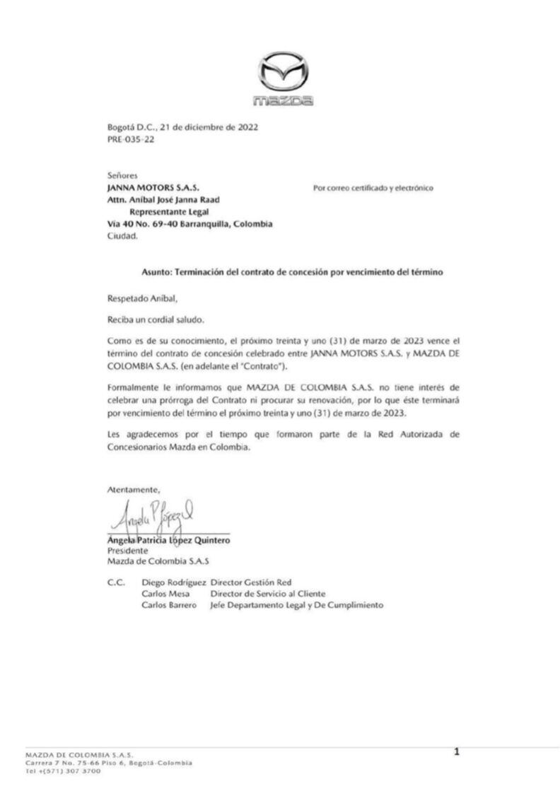 El 21 de diciembre del año pasado Mazda le envió una carta a esa empresa, cuyo representante legal es Aníbal Janna, diciéndole que no le renovarán el contrato que se termina el 31 de marzo de 2023, pese a que tenían una relación de 23 años.
