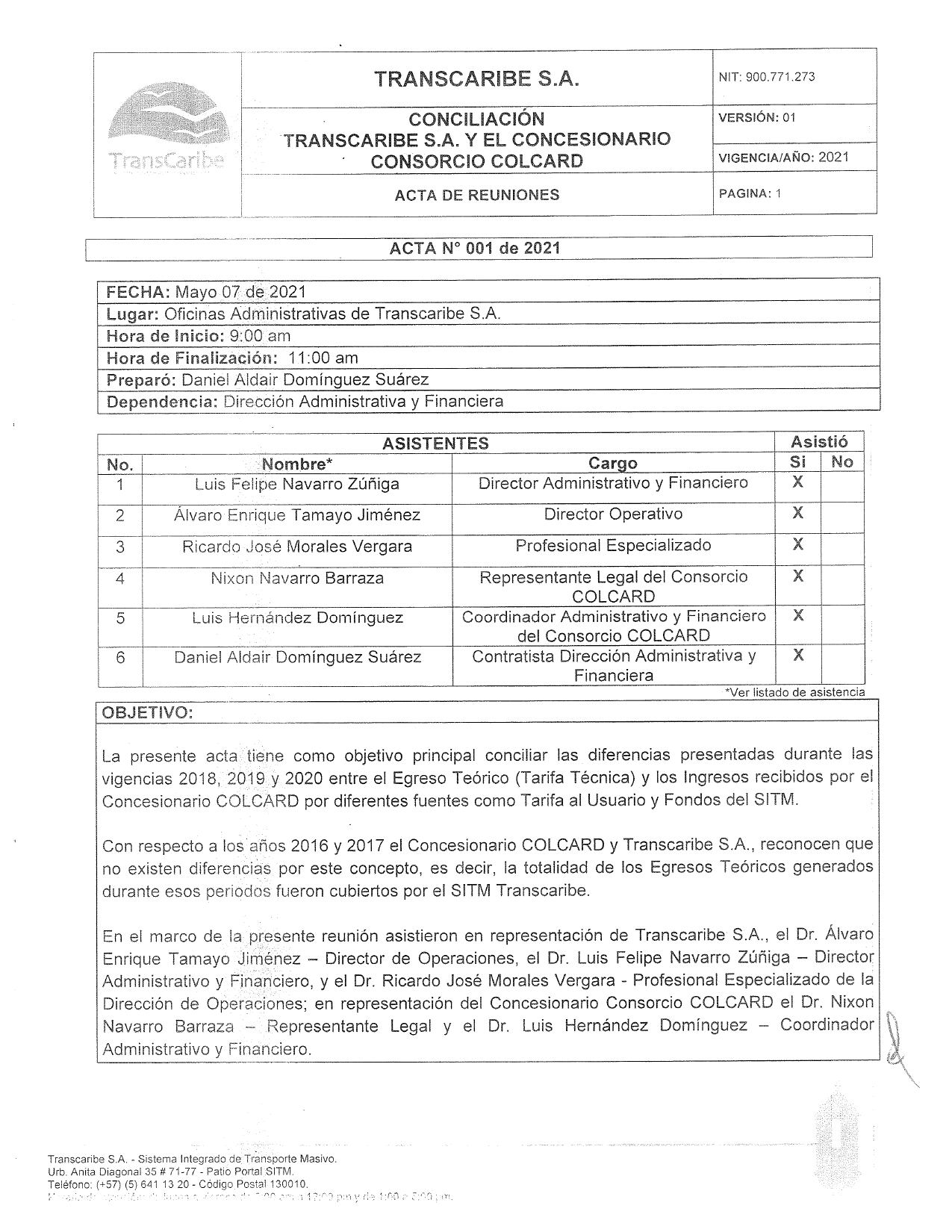 El 7 de mayo de 2021, bajo acta número 01 del mismo año, Conciliación Transcaribe S.A. y el concesionario Consorcio Colcard, se firma por parte de los asistentes el documento que reconoce la deuda de Transcaribe y que no ha sido cancelada.