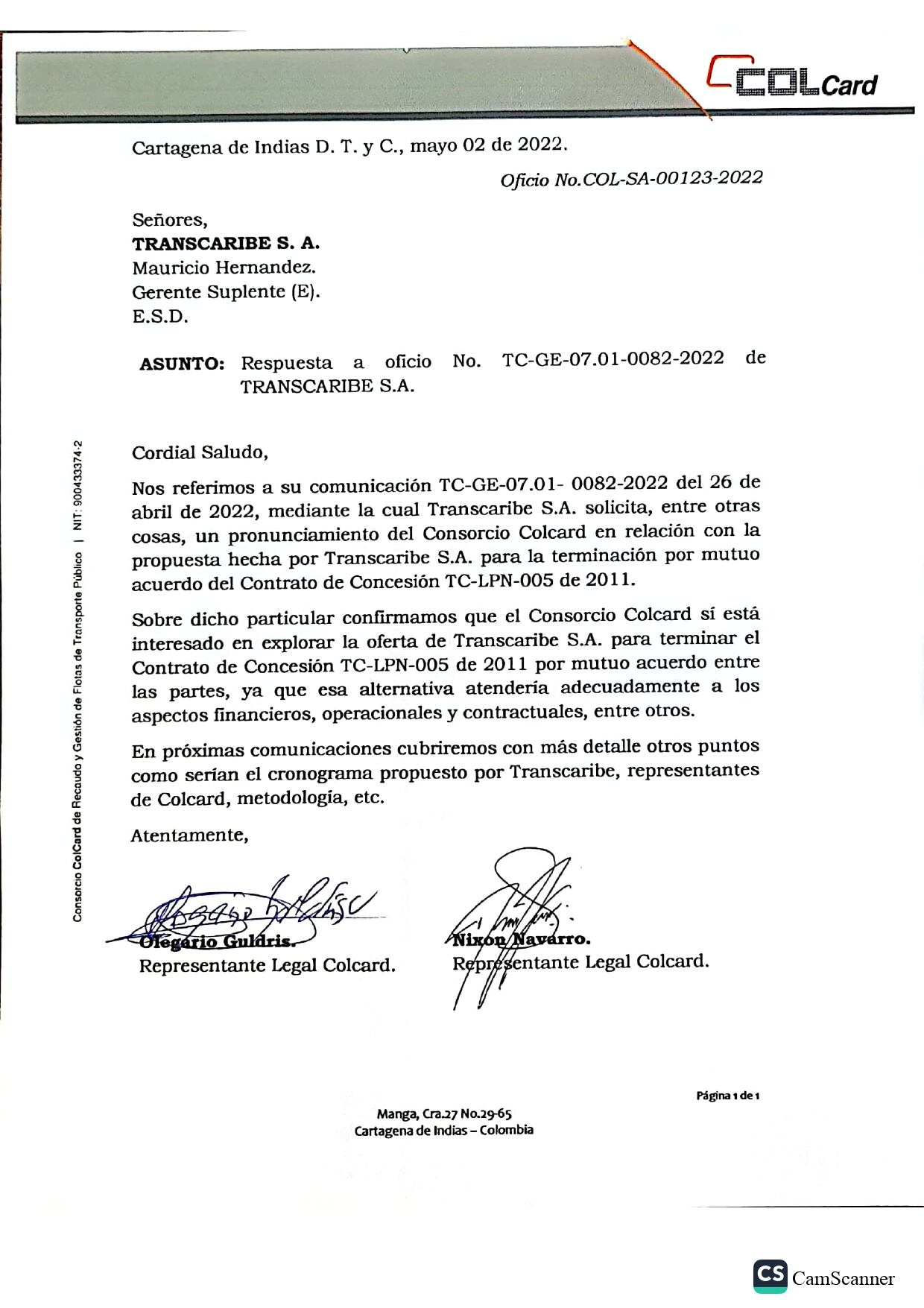 Ante los anuncios de liquidar el contrato de recaudo, Colcard, en comunicación del 2 de mayo de 2022, le manifestó a la administración distrital que estaba dispuesta a una terminación por mutuo acuerdo, pero no se definió nada.