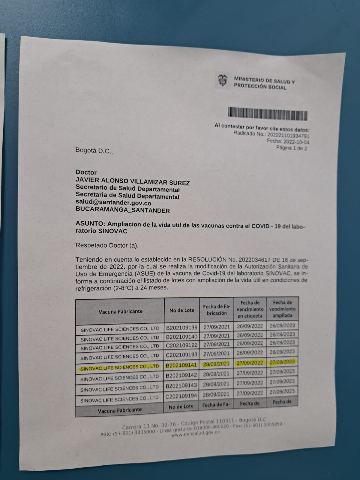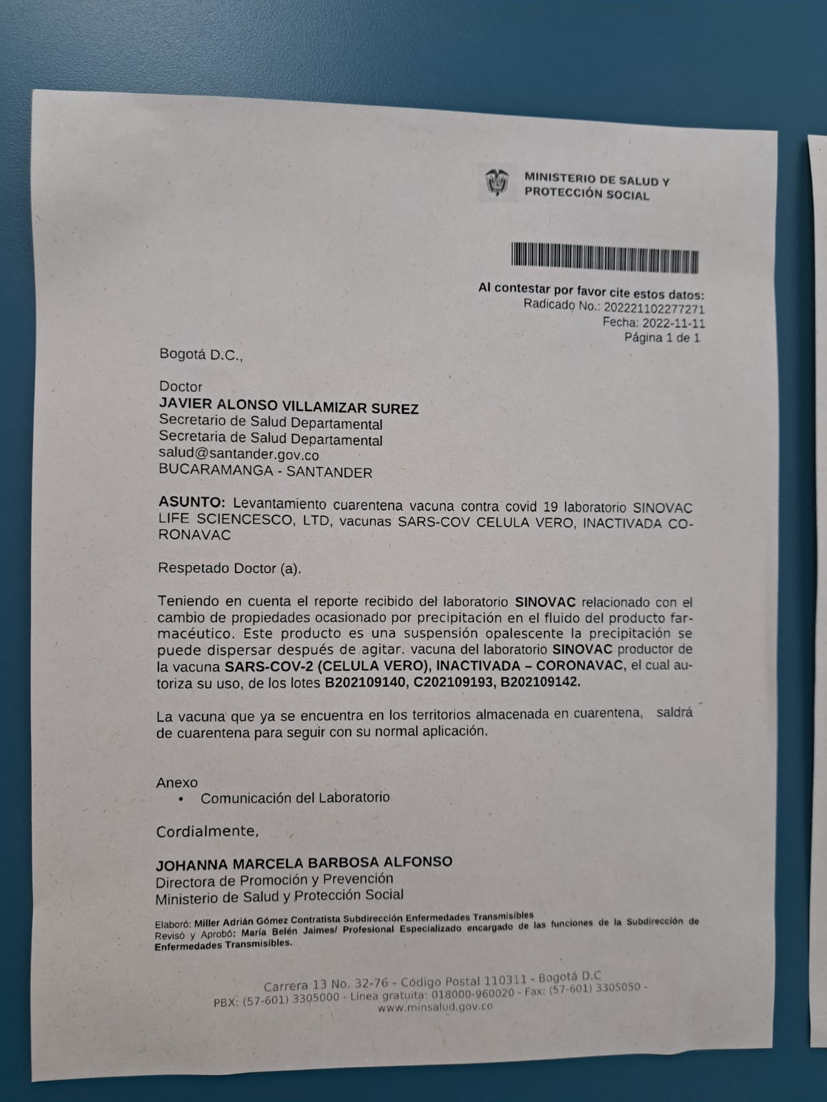 “Todas las vacunas en Santander están así, nosotros recibimos una resolución del Ministerio de Salud en donde notifica que fue ampliada su vida útil hasta el 2024 y no hay problemas, o sea siguen teniendo su efecto natural”, dijo Villamizar.