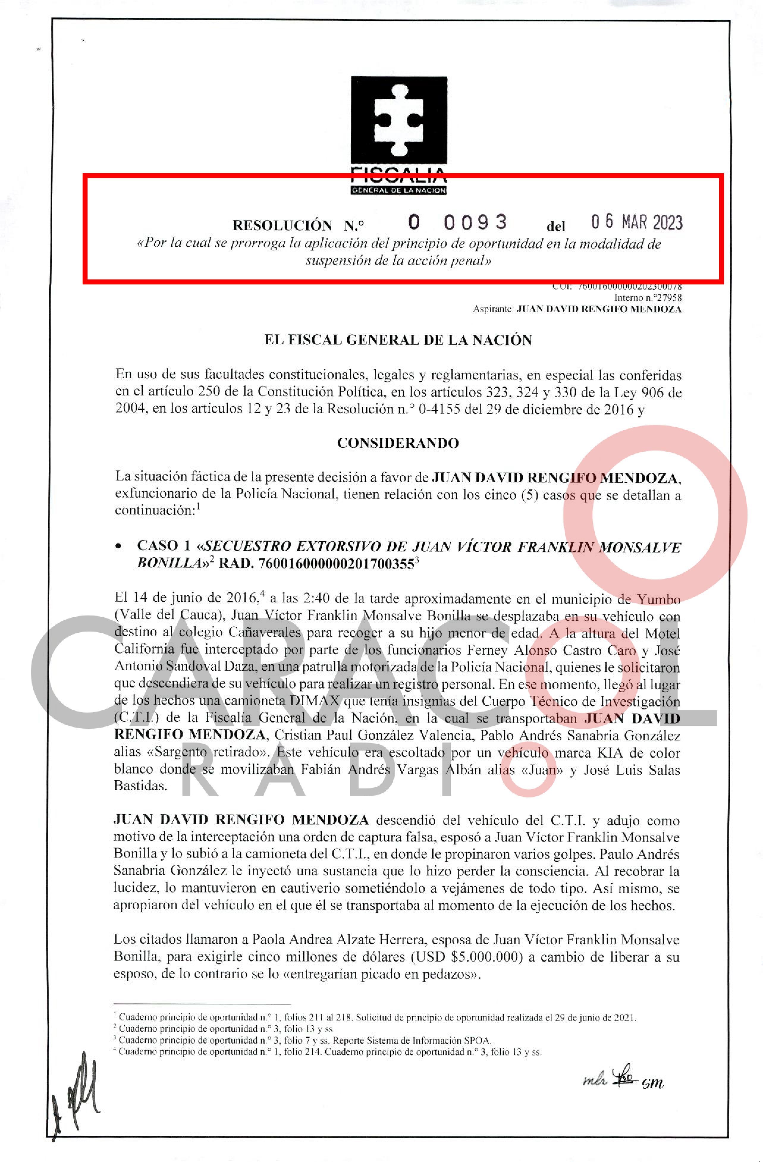 Caracol Radio conoció que la Fiscalía prorrogó por un año más el principio de oportunidad a Juan David Rengifo, alias ‘La R’ y quien es el testigo principal en el proceso que se sigue en contra de los presuntos “narcofiscales”.