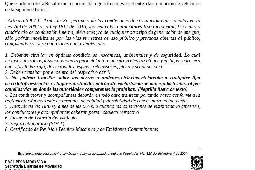 De acuerdo con el Distrito, los ciclomotores, motociclos o Moped tendrán que tener al día la licencia de conducción, la licencia del vehículo, la revisión técnico mecánica al día y deberán comprar el seguro obligatorio SOAT.