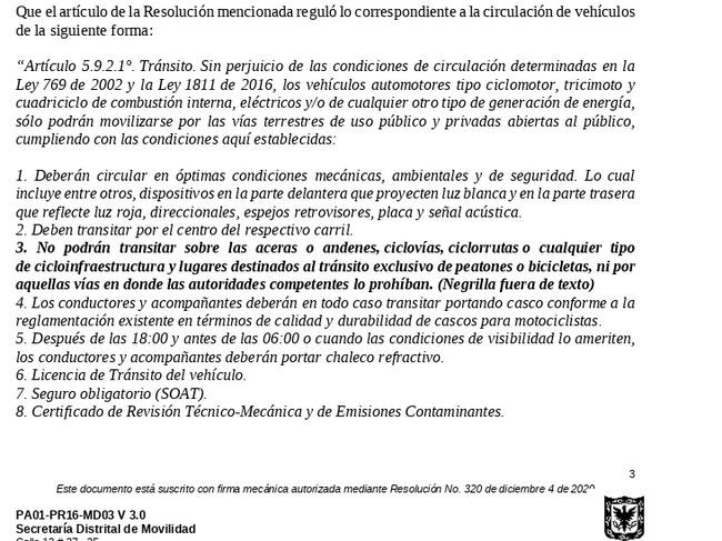 “No podrán transitar sobre las aceras o andenes, ciclovías, ciclorrutas o cualquier tipo de ciclo infraestructura y lugares destinados al tránsito exclusivo de peatones o bicicletas, ni por aquellas vías en donde las autoridades competentes lo prohíban” explicó la entidad.