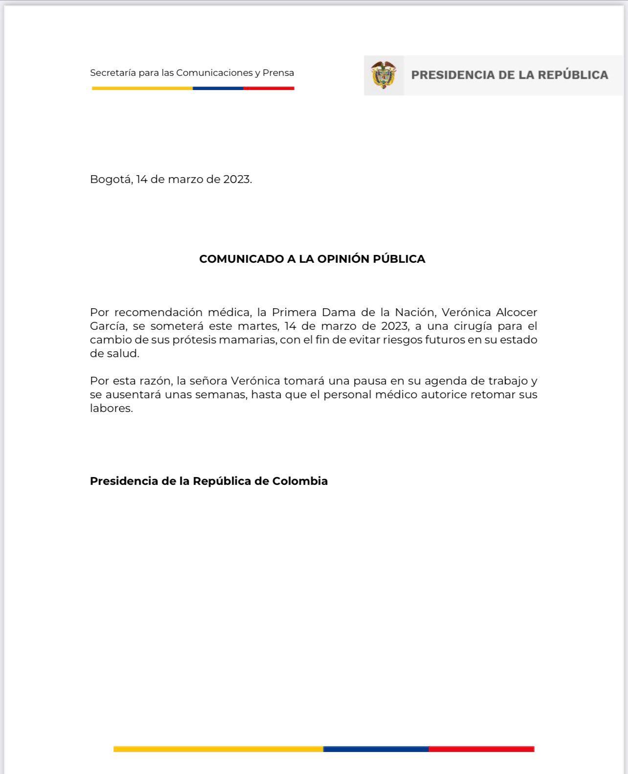 “Por recomendación médica, la Primera Dama de la Nación, Verónica Alcocer García, se someterá este martes, 14 de marzo de 2023, a una cirugía para el cambio de sus prótesis mamarias, con el fin de evitar riesgos futuros en su estado de salud”, señala la misiva.