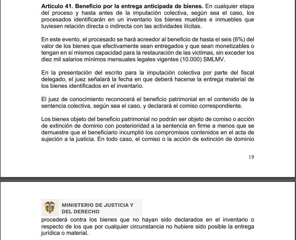 El artículo 41 señala que, en cualquier etapa del proceso y hasta antes de la imputación colectiva, los procesados identificarán en un inventario los bienes muebles e inmuebles que tuviesen relación directa o indirecta con las actividades ilícitas.