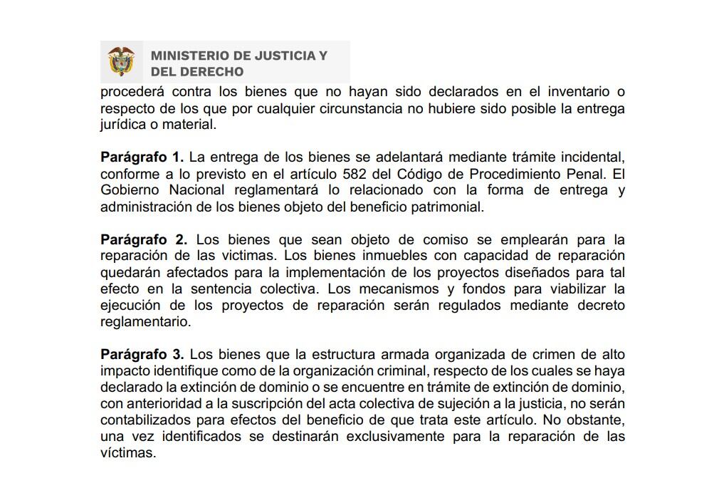 El proyecto de ley de sometimiento de bandas criminales que fue radicado este martes en el Senado de la República, amplía los beneficios para quienes delaten el patrimonio ilegal de esos grupos ilegales y podrían quedarse hasta con el 6% de los bienes que entregue.