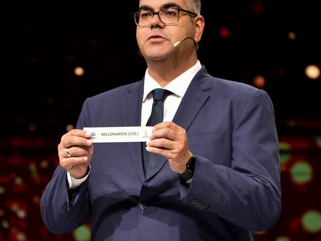Frederico Nantes, director de competiciones de la Conmebol mostrando el nombre de Millonarios en el sorteo de la fase preliminar de la Libertadores (Photo by NORBERTO DUARTE/POOL/AFP via Getty Images) / NORBERTO DUARTE