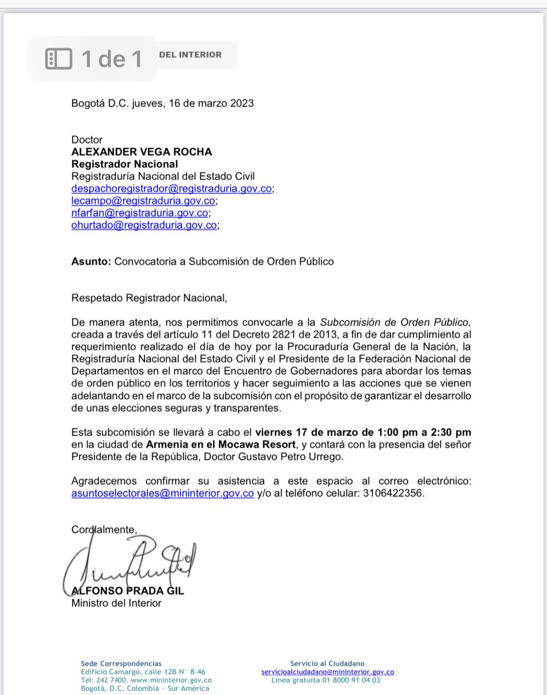 “De manera atenta, nos permitimos convocarle a la Subcomisión de Orden Público, creada a través del artículo 11 del Decreto 2821 de 2013, a fin de dar cumplimiento al requerimiento realizado el día de hoy por la Procuraduría General de la Nación, la Registraduría Nacional del Estado Civil y el Presidente de la Federación Nacional de Departamentos en el marco del Encuentro de Gobernadores para abordar los temas de orden público en los territorios y hacer seguimiento a las acciones que se vienen adelantando”, explica el documento.