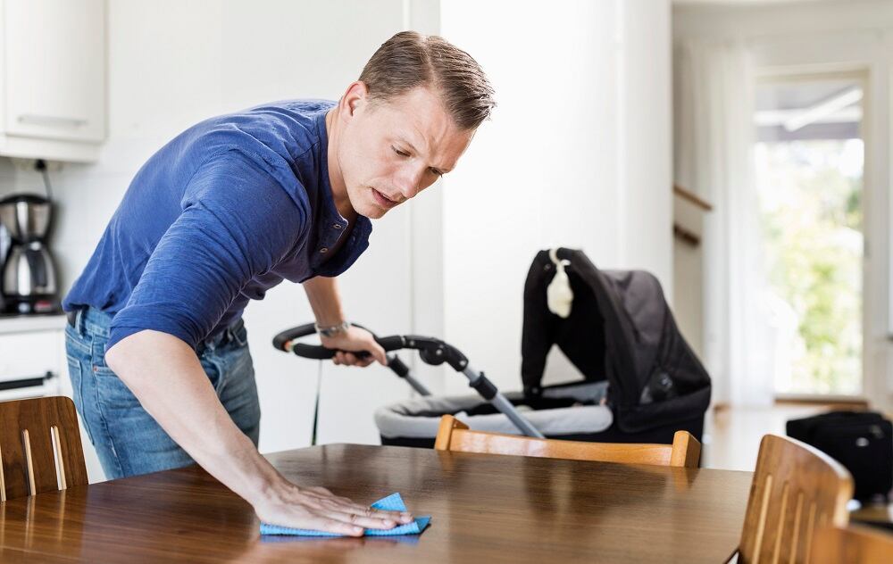 Los hombres aprendan sobre limpieza y mantenimiento del hogar. / Maskot