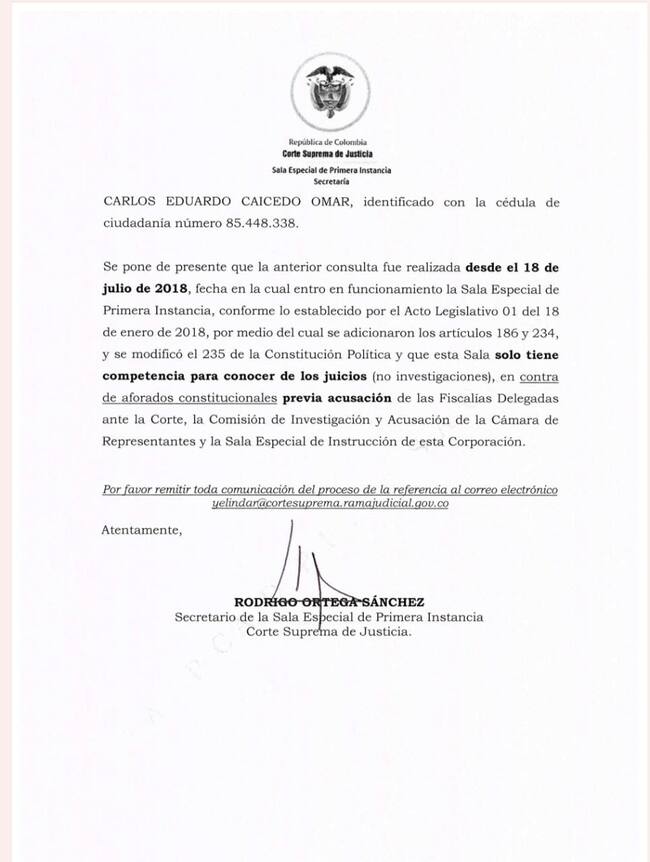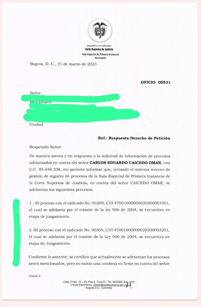 Se trata de un oficio de la Corte Suprema con el que tratará de demostrar ante el Tribunal Superior de Bogotá que los procesos en su contra no están relacionados con su cargo de gobernador