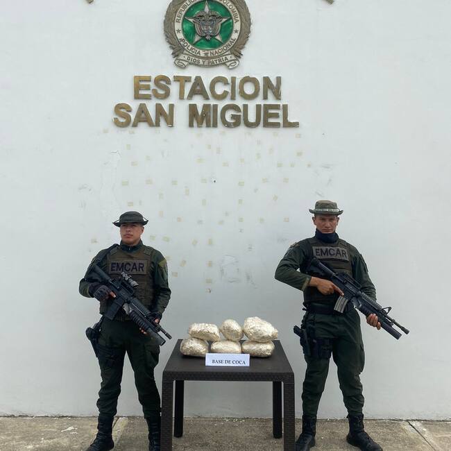 En el operativo realizado por personal del Escuadrón Móvil de Carabineros, en zona urbana de la vereda el Maizal del municipio de San Miguel, lograron hallar abandonada a orillas de la carretera oculta entre la vegetación, una lona plástica a rayas, la cual al momento de ser verificada tenía en su interior varios paquetes con una sustancia pulverulenta, de características similares a las de base de coca.