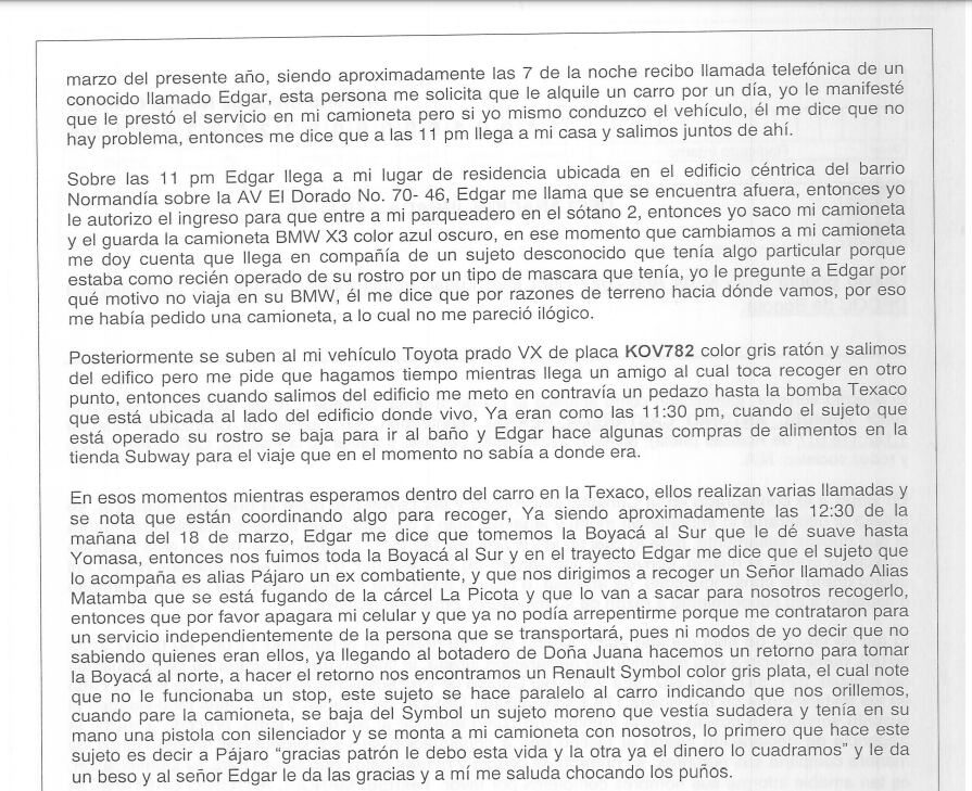 En su testimonio, Manuel narró que ‘el Caballista’ lo contactó en la noche del 17 de marzo del año pasado para un alquiler de una camioneta para hacer un viaje. Él accedió y hasta se ofreció de conductor, pero lo que no pensaba es que también iba a ir alias ‘el Pájaro’, un peligroso paramilitar.