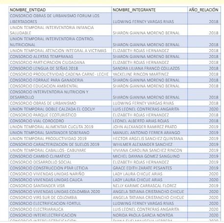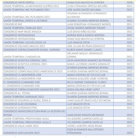 Algunos de estos consorcios y uniones temporales tienen en común, por ejemplo, el mismo revisor fiscal: José Aristóbulo Moreno Maldonado, así como algunos representantes legales. Por ejemplo, si la empresa es para hacer interventoría, la representante podría ser Diana Susi Mahecha Herrera; si son obras de electrificación, aparece Luis Leonel Contreras Angarita; si son por ejemplo de siembra de cultivos o de tecnología, aparece Sharon Gianina Moreno Bernal, si es de construcción de vías, puede aparecer Nórida Paola García Nontoa o si es de Atención a Víctimas o trabajo con comunidad aparece Elizabeth Rojas Hernández, la exesposa de Juan Carlos Manosalva.