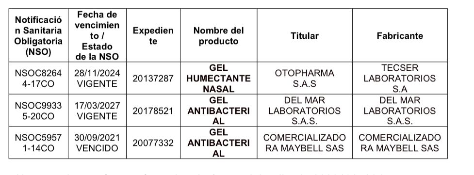 De otra parte, el Invima verificó dentro de las bases de datos del Instituto, empleando las Notificaciones Sanitarias Obligatorias reportadas NSCO82644- 17CO, NSOC99335-20CO y NSOC59571-14CO, es decir, los códigos que aparecían en los geles, encontrando lo evidenciado en este cuadro:
