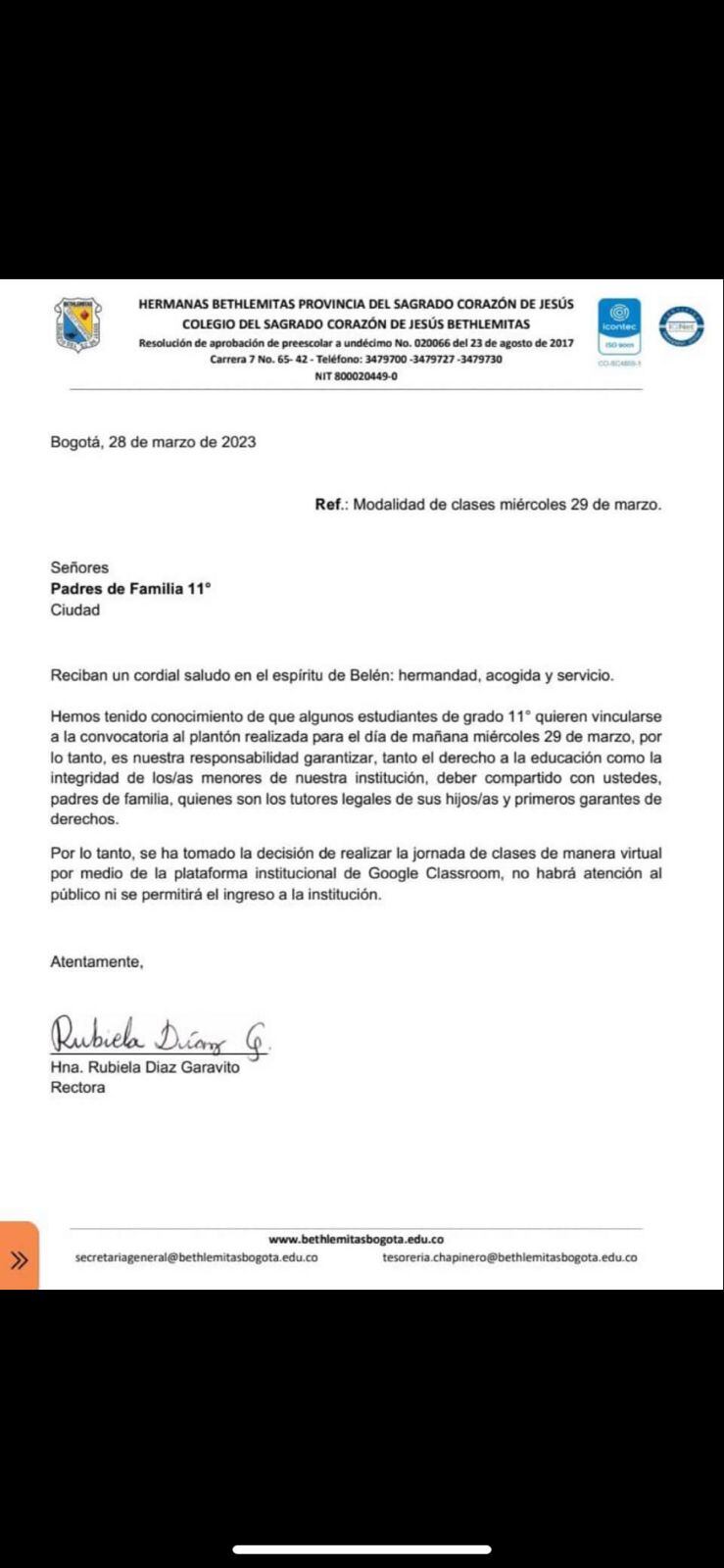 Por último, en una carta dirigida a los padres de familia, el colegio anunció que el día de las manifestaciones se realizarán las clases de forma virtual.